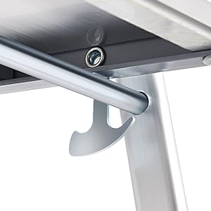 Mechanizm blokujący znajduje się pod górnym stopniem, co zapewnia bezpieczeństwo użytkowania i składania. Po rozłożeniu drabiny unikalny szeroki mechanizm automatycznie blokuje ramę. Musi również nacisnąć przycisk mechanizmu i skośną drabinę, aby złożyć.