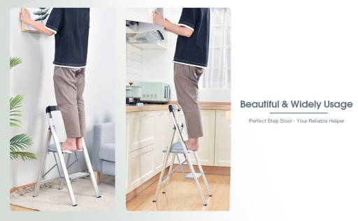 Lekkie aluminium i niezwykle smukła konstrukcja pozwalają na wygodne przechowywanie i transport. Oszczędzająca miejsce konstrukcja drabiny schodkowej złożonej do zaledwie 1,5 cala do przechowywania. Składa się kompaktowo, aby zmieścić się w ciasnym miejscu w garażu, pod łóżkiem lub w wygodnym rogu.