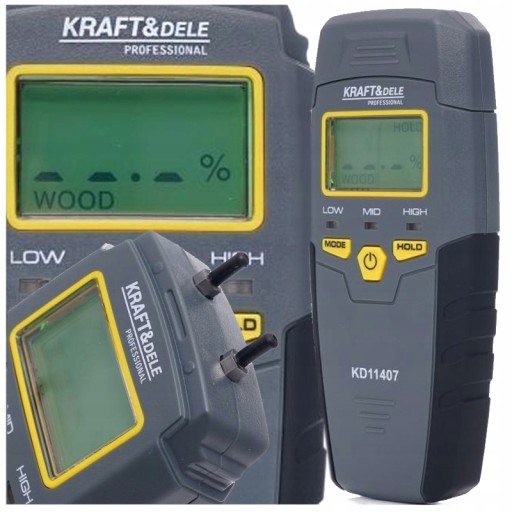- Miernik wilgotności marki Kraft&Dele Model KD11407 mierzy zawartość wilgotności, wykrywając rezystywność elektryczną materiału docelowego za pomocą dwóch pinów.