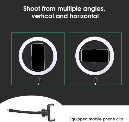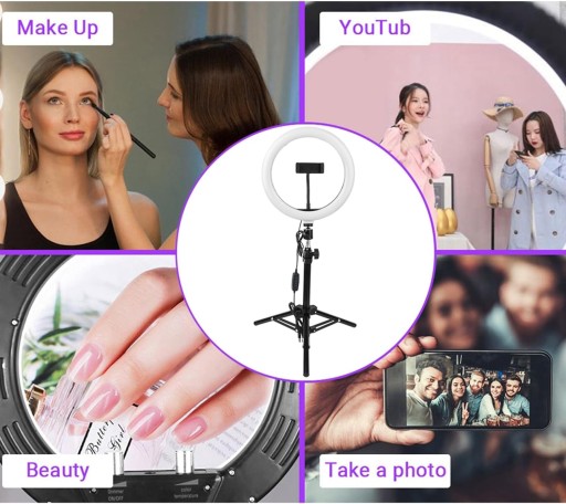 Wysoka jasno 10calowa lampa piercieniowa ze stojakiem i uchwytem na telefon zapewnia obfite owietlenie Twojego najlepiej wygldajcego siebie. Efekt otaczajcego wiata dobrego piercienia wietlnego natychmiast redukuje cienie na twarzy i minimalizuje przebarwienia jednoczenie owietlajc oczy. Regulowana temperatura barwowa Posiada 3kolorowe tryby owietlenia zimne wiato ciepe wiato ciepe zimne wiato kady tryb ma 10 poziomów jasnoci aby speni róne potrzeby. Idealny dla fotografów YouTuberów Vlogerów TikTokerów itp. Wszechstronne akcesoria sterowanie zasilane przez port USB pomaga chroni Twoje bezpieczeństwo jednoczenie poprawiajc jasno wiata piercieniowego. Szeroko klipsa do telefonu komórkowego ok. 5585 cm2133 cala jest kompatybilny z prawie WSZYSTKIMI smartfonami z etui lub bez. Zdalne fotografowanie Uwolnij rce dziki bezprzewodowemu pilotowi. Nie pozwól aby skomplikowana operacja ograniczaa Twoj twórczo. Doskonae dodatkowe wiato do selfie które usuwa wszystkie niepochlebne cienie. Znacznie popraw jako produkcji schlebiaj swojej cerze i zapewnij sobie wyjtkowe narzdzie do tworzenia nieskazitelnych treci. Róne zastosowania lampa piercieniowa Led do codziennej pracy i ycia. Idealny do samouczka makijau Facebooka Instagrama i transmisji na ywo wideokonferencji Zoom tworzenia treci. Doskonay do wszelkiego rodzaju fotografii z bliska i filmowania. Takich jak moda reklama portret lub.