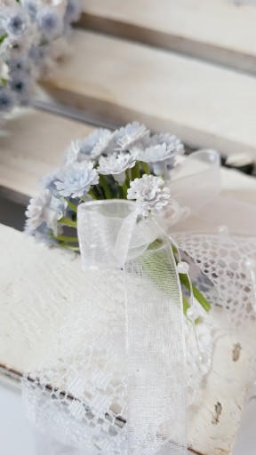 Wianek komunijny + ozdoba na świece wykonany z sztucznej gipsówki w kolorze błękitu do złudzenia wygląda jak żywa. Wianek posiada w tyle regulacje można rozwiązać kokardki i dopasować do główki dziewczynki .