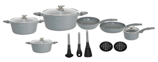 Solidne ciężkie garnki renomowanej firmy EDENBERG wykonane z wysokiej jakości litego aluminium i pokryte ceramiczno marmurkową powłoką. Piękny szary kolor. Ilość elementów 15 szt. Dno akutermiczne 3 warstwowe, dzięki czemu żywność nagrzewa się szybko, materiał długo trzyma ciepło oraz energii zużywa się mało.