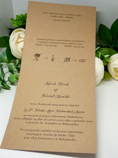 W środku zaproszenia możemy wpisać dowolny wierszyk, cytat.