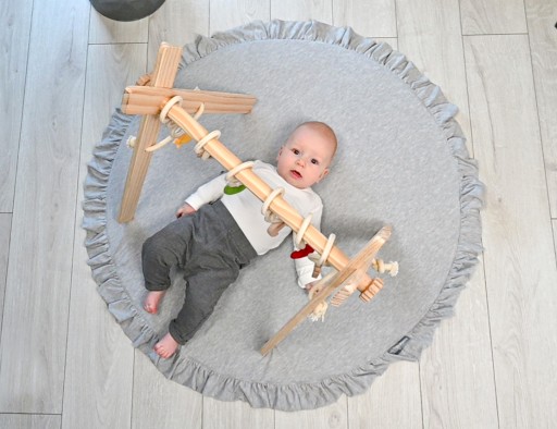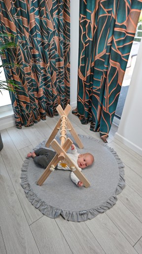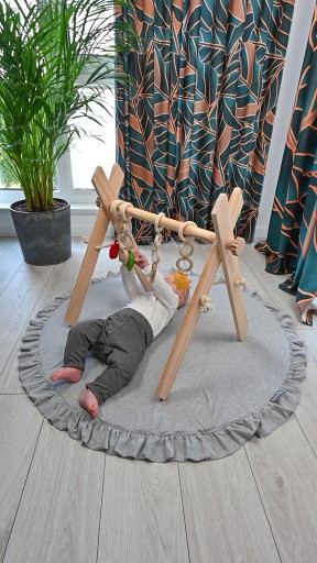 Drewniany trapez gimnastyczny dla niemowląt z miękką matą to kompletny zestaw wspomagający rozwój dziecka od pierwszych dni życia. Stojak z zawieszkami skupia wzrok maluszka, stymuluje zmysły i zachęca do zabawy, a miękka mata chroni przed twardą podłogą.