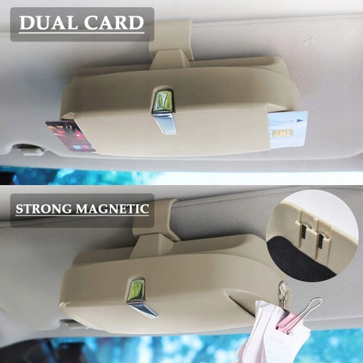 Wbudowane przegródki na karty Po lewej i prawej stronie wbudowane s dwie przegródki na karty które mog by uywane do parkowania kart kart o duej prdkoci kart kredytowych kart adowania itd. Dziki przegródkom na karty nie moesz zapomnie gdzie znajduj si karty oszczdzasz czas i szybki dostp. Materia odporny na zarysowania Etui na okulary przeciwsoneczne wymiary 17 x 8 x 5 cm wykonane z wysokiej jakoci materiau ABS o gadkiej powierzchni a aksamitny materia wewntrz jest odporny na wysokie temperatury i uderzenia. Dobrze zbudowana i solidna konstrukcja w poczeniu z wygodnym uczuciem w dotyku mocna i trwaa do dugotrwaego uytkowania. Pole magnetyczne z boku organizer na okulary przeciwsoneczne posiada pole magnetyczne które optymalnie wykorzystuje miejsce podpiera uycie tradycyjnych etui na okulary i moe by uywany jako uchwyt na bilety do przechowywania paragów i przechowywania monet. Konstrukcja przyjazna dla uytkownika Ten uchwyt na okulary moe by bezpiecznie przymocowany do osony przeciwsonecznej bez utrudniania widocznoci kierowcy i zapewnia atwy i szybki dostp do okularów kiedy tylko chcesz ich uy. Uniwersalne zastosowanie nadaje si do wikszoci okularów i modeli samochodów takich jak Jeep i SUV. Wystarczy zamocowa oson przeciwsoneczn samochodu wczy i wyczy jedn rk i jednym naciniciem przycisku. Nadaje si do wikszoci okularów okularów przeciwsonecznych i okularów. Nie musisz ju martwi si o szukanie okularów które zapewniaj bezpieczeństwo jazdy.
