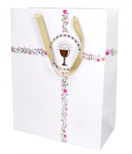Torebka prezentowa w białym kolorze zdobiona kolorowym wzorem i eleganckim nadrukiem hostii, stanowi wyjątkowe opakowanie dla Twoich podarunków. Jej trwała konstrukcja sprawia, że doskonale nadaje się na różne okazje, zwłaszcza te związane z uroczystościami religijnymi czy świętami. Oryginalny wzór i delikatny nadruk dodają torebce wyjątkowego charakteru, co z pewnością przyciągnie uwagę obdarowanej osoby.