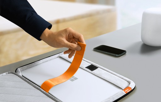 Wnętrze pokrowca wyściełane zostało delikatnym materiałem oraz grubą warstwą wypełnienia. Znajduje się tam także kieszeń rozciągnięta na całą długość teczki, do której wsuwa się laptopa. Przyszyty jest do niej rzep, do którego przyczepia się ochronny pasek utrzymujący sprzęt w miejscu.