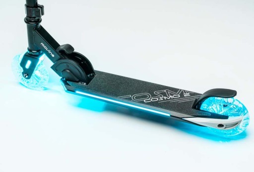 Z Movino Cosmo2 twoje dziecko zapomni o nudzie . Za pomocą jednego przycisku zmienia się w pojazd jak z innej planety. Światła wbudowane w podest gwarantują niesamowitą zabawę i zachwycą nie tylko dziecko. Możliwy jest wybór jednego z 7 dostępnych kolorów oświetlenia. Hulajnoga przeznaczona jest dla dzieci w wieku od 5 do około 8 lat. Wielkość hulajnogi została tak dobrana, aby małym użytkownikom jeździło się na niej wygodnie.