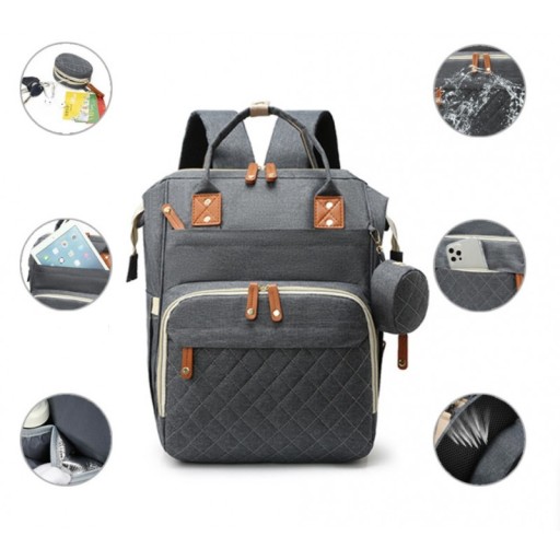 Podczas spaceru czy podróży z niemowlęciem z pewnością przyda Ci się dobra torba do wózka, w której zmieścisz wszystkie niezbędne rzeczy, a ten plecak z pewnością sprosta Twoim oczekiwaniom! Posiada dużą ilość przegródek i kieszeni, w tym specjalne miejsce z folią termoizolacyjną na butelki, a także kieszeń na brudne pieluchy. Dodatkowo tył plecaka przekształca się w przewijak umożliwiający zmianę pieluchy w dowolnym miejscu i momencie. Plecak możesz nosić na ramionach lub zawiesić go na wózku przy pomocy dołączonych zaczepów. Posiada port USB i kabel ułatwiający ładowanie telefonu w trakcie spaceru.