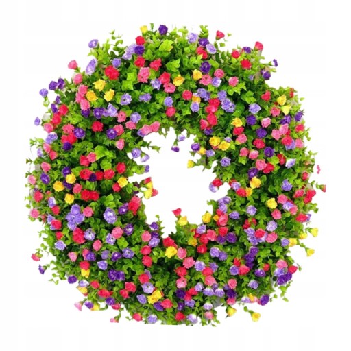 Piękny wieniec ze sztucznych kwiatów: usiany małymi kwiatkami, zielonymi liśćmi eukaliptusa i wygodnym kolorem, wyraźnie wiszący na drzwiach wejściowych, dzięki czemu gość poczuje powiew wiosny.