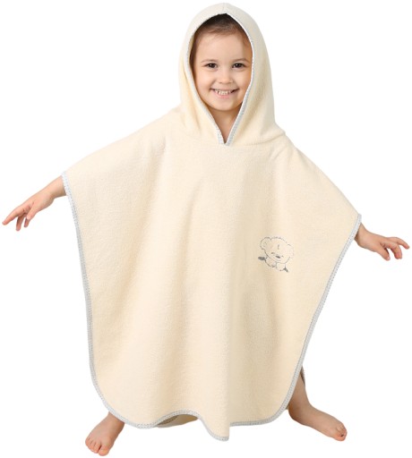 Poncho kąpielowe z kapturkiem pozwala na samodzielne otulenie dziecka po kąpieli. Odpowiednio gruba bawełniana termofrotte zapewnia wysoką chłonność i szybko wysycha, a dzięki meszkowi jest milutka i nie podrażnia delikatnej skóry maluszka. Kapturek jest obszerny, przód ozdobiony niepowtarzalnym haftem a całość starannie obszyta subtelną lamówką. Duży rozmiar ręcznika umożliwia dokładne otulenie i utrzymanie cennego ciepła przy ciele przez dłuższy czas.