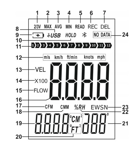 - °CM² - Jednostka powierzchni w metrach kwadratowych przy funkcji pomiaru przepływu.°C - Jednostka temperatury dla pomiaru temp. powietrza. °FT² - Jednostka powierzchni w stopach kwadratowych przy funkcji pomiaru przepływu. °F - Jednostka temperatury dla pomiaru temp. powietrza.