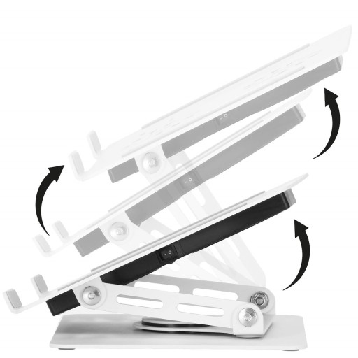 Nasz podstawka została wyposażona w elementy antypoślizgowe, dzięki którym je podstawa stabilnie leży na gładkim podłożu i nie przemieszcza się. Silikonowe nakładki znajdują się także na podstawie górnej, gdzie zapobiegają przemieszczaniu się i zsunięciu laptopa.