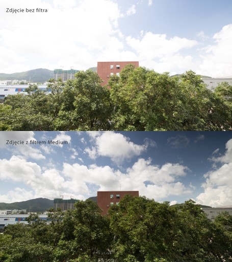 Średnie przejście tego filtra umożliwia przyciemnienie niektórych partii zdjęcia, takich jak jasne niebo, przy jednoczesnym nienaruszeniu ekspozycji na pozostałym obszarze. Filtr jest najgęstszy na brzegu i jaśnieje do środka, gdzie obszar przejścia jest większy niż w przypadku filtrów o gradacji twardej (Hard) i zarazem mniejszy niż w przypadku miękkich (Soft).