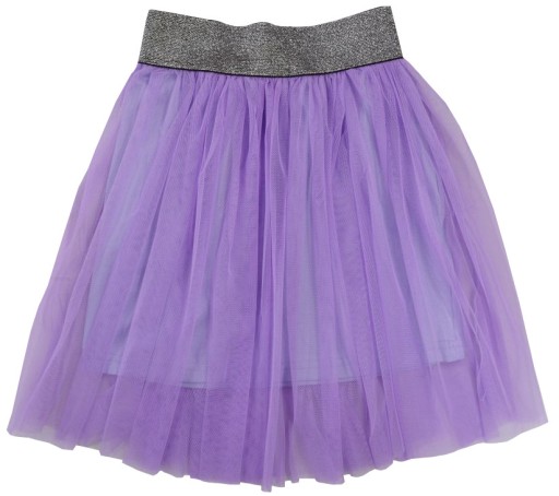 Krój: Spódnica na podszewce, wierzchnia warstwa z miękkiego tiulu, w pasie na ozdobnej, brokatowej gumie.