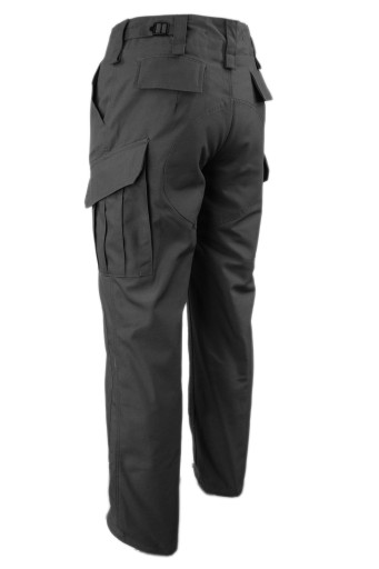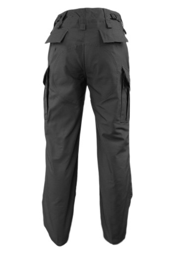 Krój spodni ze wzmocnieniami na pośladkach, kroczu i kolanach zapewnia długi okres użytkowania. Regulacja w pasie odbywa się poprzez ściągacze z klamrą, znajdujące się po obu bokach spodni. Rozporek zapinany jest na guziki.