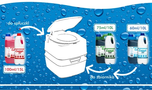 Płyn do toalet turystycznych Campi Green 5 L Campi Green to skoncentrowany płyn, rozkłada zawartość w zbiornikach na fekalia w przenośnych toaletach oraz stałych urządzeniach toaletowych w przyczepach kempingowych i na jachtach. Wchodząca w skład preparatu kompozycja zapachowa zapewnia w pomieszczeniu wrażenie czystości i świeżości. Nie zawiera formaldehydu. Zielony barwnik pozwala kontrolować częstotliwość wykonywania zabiegów. Preparat jest przyjazny dla środowiska i łatwo ulega biodegradacji.