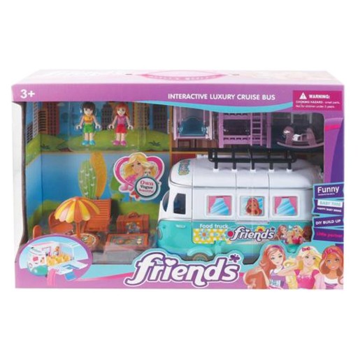 - Autobus w zestawie z huśtawką, bujanym koniem, łóżkiem piętrowym, 2 krzesełkami, lalką dziewczynką i chłopcem, stolikiem plażowym z parasolem i leżakiem oraz grillem.