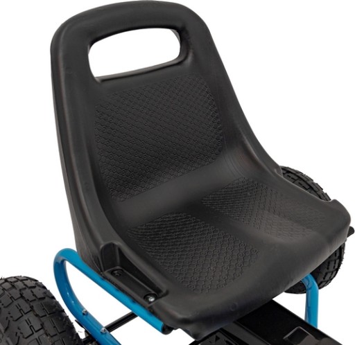 Mocna konstrukcja, gumowe pompowane koła, hamulec ręczny, sportowy fotel z trzystopniową regulacją ,wszystkie koła łożyskowane