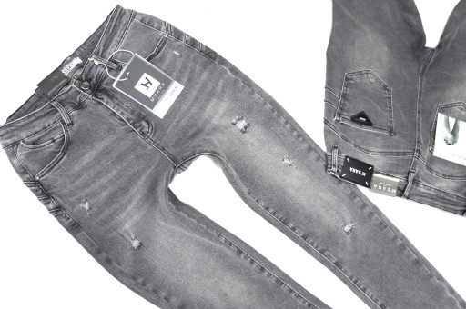 - nogawki zwężane ku dołowi, dopasowane typu rurki z małymi dziurami, przetarciami