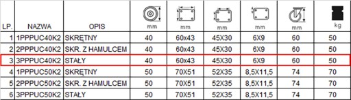 Koło składa się z polipropylenowej piasty oraz z niebrudzącej poliuretanowej opony, posiada podwójne łożysko kulkowe. Mocowanie zestawu na płytkę o kodzie 3PPPUC402K. W tabeli pod pozycją 3.