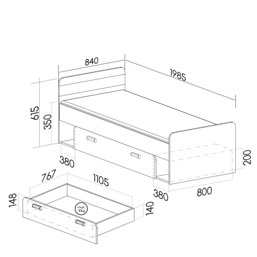 Łóżko pojedyncze młodzieżowe szufladą pojemnikiem 80x195 Lorento L13