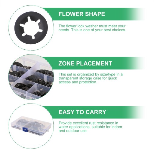 ✅ 7 rozmiarów łącznie 340 sztuk w przezroczystym pudełku, odpowiednich do różnych rozmiarów elementów złącznych.