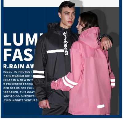Dwuczęściowy kombinezon przeciwdeszczowy z dużą ilością odblaskowych paneli.