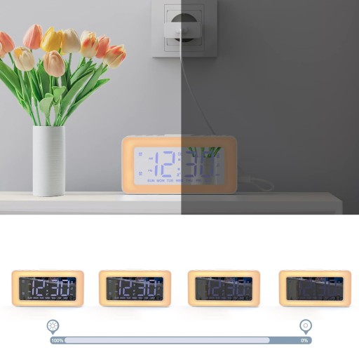 ✅Wielofunkcyjny podświetlany budzik, który przekracza wszelkie oczekiwania wobec zegara stołowego – elektroniczny budzik z 8 trybami dynamicznego, kolorowego światła zmieniającego kolor zapewnia wesołą atmosferę. Przyciemnij światło, gdy jesteś wrażliwy na światło w nocy, naciskając 10-poziomowy przycisk „+” lub „-”. Możesz używać tego zegara cyfrowego jako lampki nocnej/lampki nocnej/lampki do czytania, wystarczy nacisnąć przycisk ☀ na górze, aby go włączyć/wyłączyć