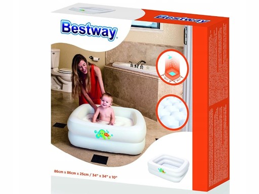 Jeśli wybierasz się na wakacyjny wyjazd razem ze swoim maluszkiem, na pewno przyda Ci się kompaktowa dmuchana wanienka. W warunkach hotelowych ciężko zorganizować domowy kącik do mycia, a propozycja od Bestway znacznie ułatwi Ci to zadanie. Dmuchana wanienka o wymiarach 86 x 86 x 25 cm jest idealna na taki wyjazd. W pełni bezpieczna dla dziecka, ponieważ posiada miękkie, dmuchane dno. Wykonana z tworzywa PVC o grubości 0,25 mm. Producent zaleca, aby korzystały z niej dzieci do trzeciego roku życia.
