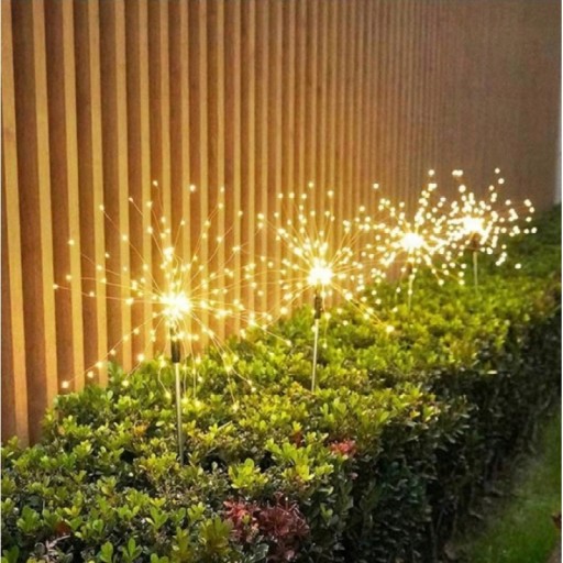 LAMPA SOLARNA FIREWORK - diody ułożone są na kształt rozbłyskających fajerwerków. Na cienkim, czarnym grocie ziemnym w połowie wysokości niczym platforma umieszczony jest moduł solarny, który jest wyposażony w akumulator zapewniający, że fajerwerki lśnią w ciemności. Lampa jest sterowana przez czujnik zmierzchu, który włącza ją wieczorem i wyłącza ponownie rano. Kolor biały ciepły światła niezliczonych diod LED stanowi wspaniały akcent świetlny w ogrodzie.