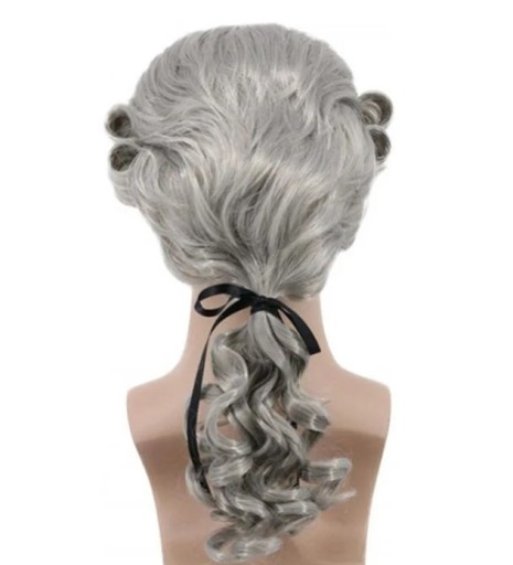 - Peruka w kolorze szarym z luźnym kucykiem, po bokach dwa spięte loki,