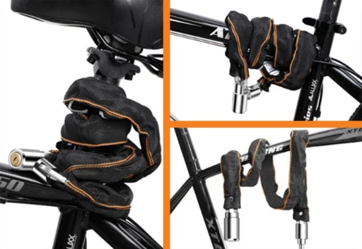 Zabezpieczenie antykradzieżowe w postaci łańcucha. Doskonale sprawdza się przy zabezpieczaniu rowerów, furtek czy bram. Pokrycie z materiału chroni przed uszkodzeniem lakieru.