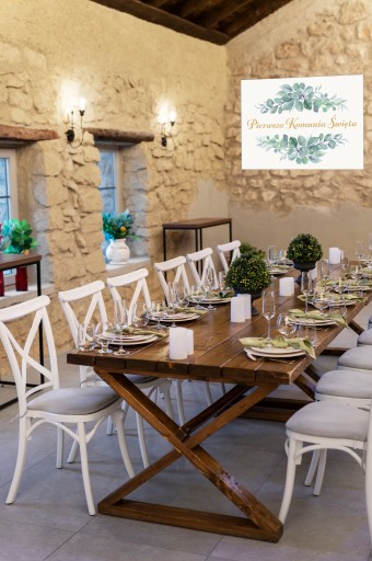 Pierwsza komunia święta to uroczystość katolicka, w której podczas mszy wierni po raz pierwszy przyjmują Eucharystię, czyli zgodnie z wyznawaną przez siebie wiarą prawdziwe ciało i krew Chrystusa pod postacią chleba, dlatego wszystkie, nawet najmniejsze szczegóły podczas tego dnia mają bardzo duże znaczenie. Plakat w bardzo popularnym stylu boho ze złotym napisem Pierwsza Komunia Święta oraz zielonym eukaliptusem.