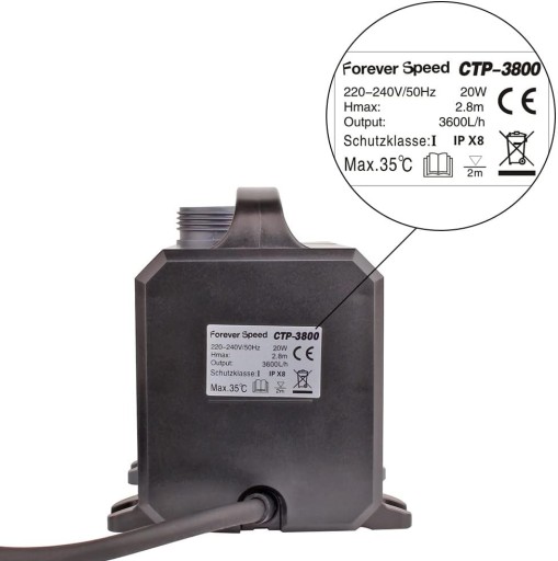 - Marka: Forever Speed, Moc: 20W, Maks. Natężenie przepływu: 3600 l / h, maks. Głowica: 2,8 m, Adapter wylotowy: 20-25-32 mm