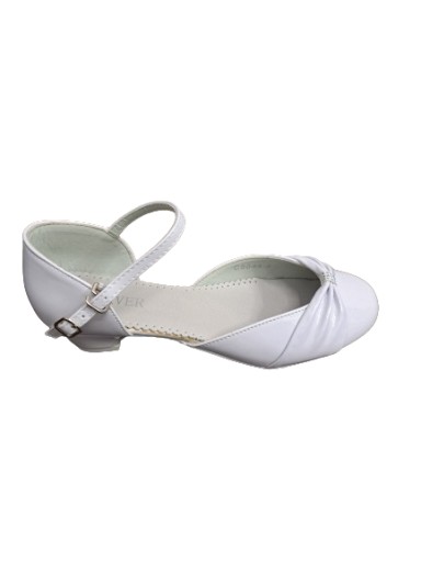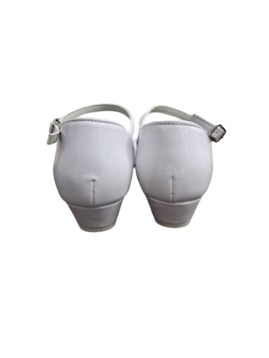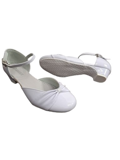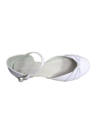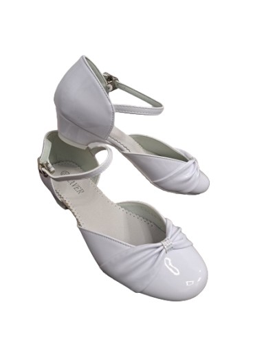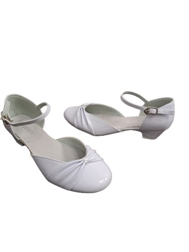 Obuwie komunijne firmy HAVER. Model wykonany z wysokiej jakości skóry ekologicznej - lakierowane. Wkładka skórzana. Obuwie z regulacją na pasku, zapinane na metalowy haczyk. Wysokość obcasa wynosi 3 cm.