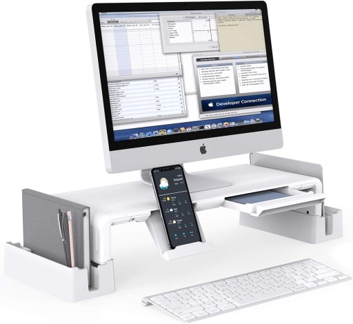- Regulowana podstawka pod monitor. Stojak na monitor jest wyposażony w stojak na telefon komórkowy i wysuwaną szufladę, w której można przechowywać długopisy, spinacze do papieru, notebooki posiada szczelinę do umieszczenia tabletu. Nie przegapisz żadnych wiadomości ani połączeń telefonicznych podczas pracy i możesz utrzymać biurko w czystości i porządku.