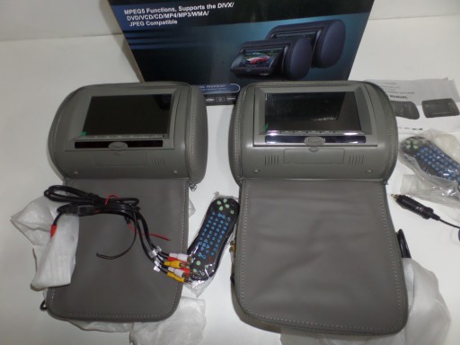 zagłówki nowe, tylko przetestowane, można je podłączyć na stałe tak jak radio lub podłączyć zasilanie przez wtyczkę do zapalniczki(1 szt. w komplecie), mają wbudowane głośniki i wyjścia na słuchawki, rozstaw na ostatnim zdjęciu.