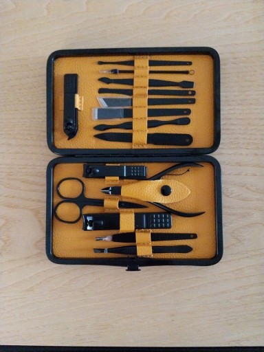 Zestaw 15 wysokiej klasy narzędzi do pielęgnacji paznokci ze stali nierdzewnej, zapakowanych w luksusową, skórzaną torbę podróżną, stanowi idealne połączenie stylu i praktyczności.
