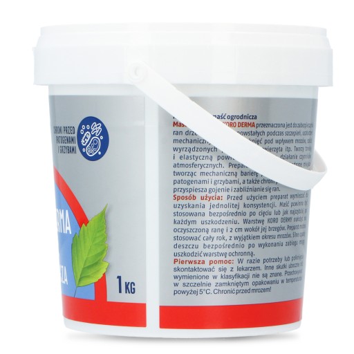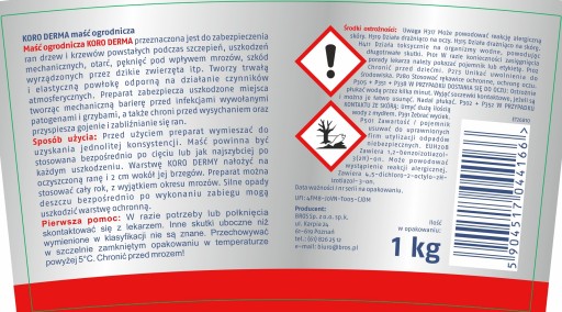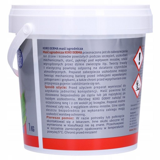 Koro-Derma to maść ogrodnicza, która zabezpiecza rany drzew i krzewów powstałych m.in. podczas uszkodzeń mechanicznych lub w trakcie mrozów. Preparat tworzy mechaniczną barierę, która zapewnia ochronę uszkodzonych miejsc przed infekcjami wywołanymi różnego rodzaju patogenami i grzybami.