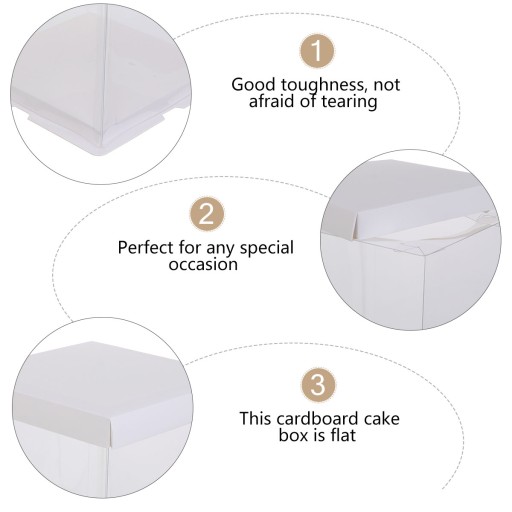 Ten produkt to pudełko na ciasto, które jest wykonane z wysokiej jakości białego papieru do praktycznego zastosowania. To pudełko na ciasto jest eleganckie i wszechstronne, dzięki czemu idealnie nadaje się na każdą specjalną okazję. To kartonowe pudełko na ciasto przychodzi płasko i jest łatwe w montażu.