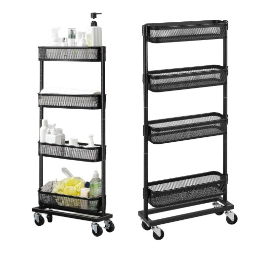 Szukasz mebla, który pomieści wszystkie Twoje akcesoria łazienkowe, kuchenne lub biurowe? Ten regał na kółkach to idealne rozwiązanie dla Ciebie. Nie tylko jest wąski i łatwy w przemieszczaniu, ale także ma kosze z regulacją wysokości, dzięki czemu możesz dostosować je do swoich potrzeb. Każdy kosz ma nośność do 4 kg, więc nie musisz się martwić o to, że się zgiął lub złamał. Możesz przechowywać na nim zarówno małe słoiki przypraw, jak i duże butelki szamponu.