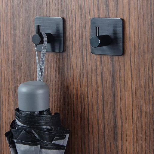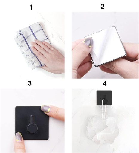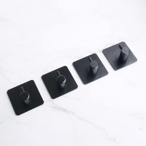 Zestaw czterech, samoprzylepnych haczyków w kolorze czarnym. Minimalistyczny, loftowy design. Doskonale sprawdzą się w kuchni, łazience, przedpokoju czy korytarzu. Wykonane z metalu i bardzo wytrzymałe. Dzięki zastosowaniu mocnej samoprzylepnej taśmy montaż odbywa się bezinwazyjnie. Nie trzeba wiercić dziur w płytkach czy ścianie. Wystarczy przykleić wieszak za pomocą bardzo mocnej taśmy, która jest w zestawie.