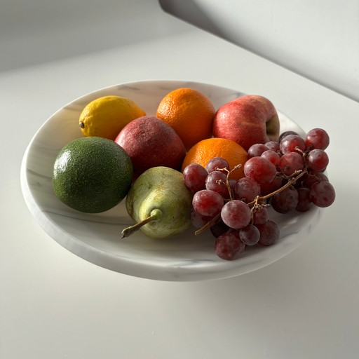 Okrągła misa ozdobna, wykonana z konglomeratu mineralnego (solid surface) w dekorze Grandex Carrara Lunar. Misa posiada owalny, symetryczny kształt, natomiast dodatkowego uroku nadaje jej przykuwający oko dekor w odcieniach bieli i szarości. Naczynie pięknie prezentuje ułożone na nim owoce, warzywa lub przekąski. Sprawdzi się również jako misa na wszelkiego rodzaju drobiazgi np. klucze. Z pewnością doda ona niepowtarzalnego charakteru każdemu pomieszczeniu.