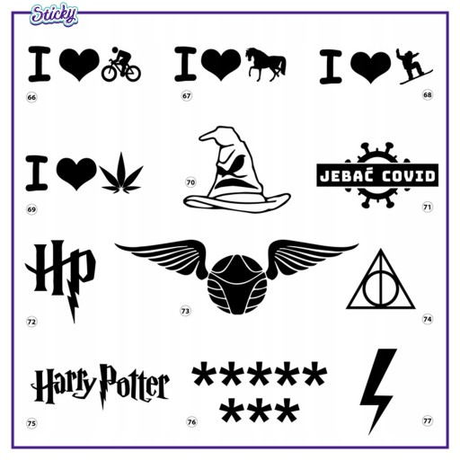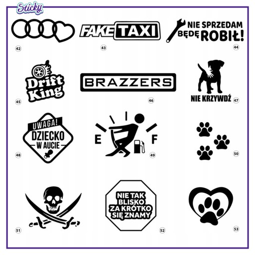 ✔️ Przedstawiamy nasz HIT zakupowy. Wszystkie najpopularniejsze wzory naklejek do wyboru na jednej aukcji. Wystarczy wybrać wzór naklejki w wiadomości do sprzedającego. Nasze wlepy obejmują tematykę postaci z bajek, ulubionego hobby, naklejek na auto i wiele wiele innych przeróżnych ciekawych wzorów. Musisz sam sprawdzić, który wzór ci odpowiada najbardziej!