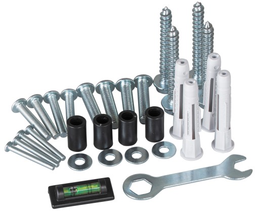 ✅W zestawie uniwersalny komplet śrub montażowych do telewizora oraz komplet wkrętów i kołków do ściany, poziomica