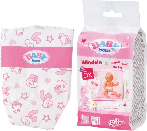 Pieluchy BABY born (5 szt.) nie mogą zabraknąć w Twoim wyposażeniu dla lalki! Pić i kakać w pieluchy, jeść i chodzić na nocnik, płakać i piszczeć, wszystko to potrafi BABY born bez baterii. Uczucie! Wystarczy mieć wystarczająco dużo czystych pieluch pod ręką.