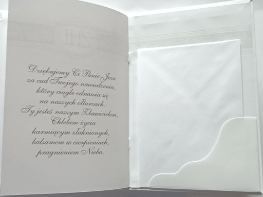 Książeczka utrzymana w tonacji białego koloru zawiera cytaty, modlitwy, teksty liturgiczne.