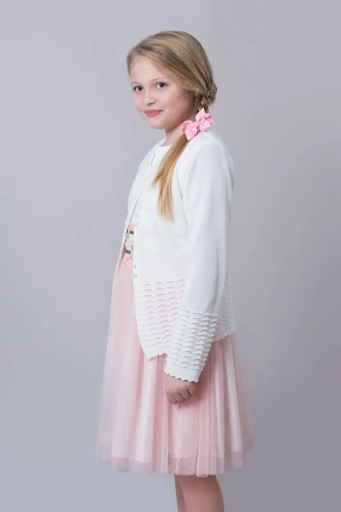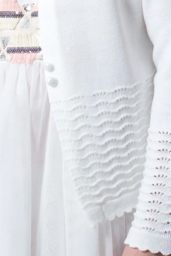 Piękny, biały sweterek dla dziewczynki rozpinany na perłowe guziczki. Dół sweterka i rękawów ozdobiony ażurkowym wzorem. Krój prosty. Idealne uzupełnienie do wizytowych lub okolicznościowych stylizacji, zwłaszcza - komunijnych. Dostępny w rozmiarach: 122-158. Produkt polski.