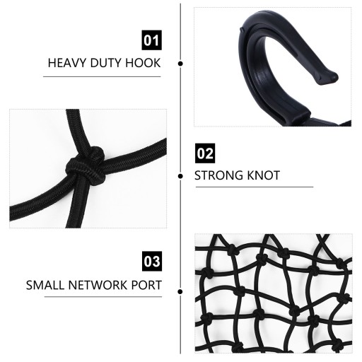 ✅ Konstrukcja złożona z siatki lateksowej i dużych haczyków może dobrze się rozciągać i zwiększać wytrzymałość, a nawet jeśli zostanie pociągnięta, może stabilnie przymocować bagaż i nie jest łatwo ją zarysować.